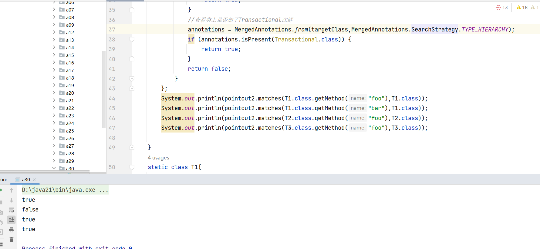 */StaticMethodMatcherPointcut pointcut2 = new StaticMethodMatcherPointcut() {@Overridepublic boolean matches(Method method, Class<?> targetClass) {//检查方法上是否加了Transactional注解MergedAnnotations annotations = MergedAnnotations.from(method);if (annotations.isPresent(Transactional.class)) {return true;}//查看类上是否加了Transactional注解annotations = MergedAnnotations.from(targetClass,MergedAnnotations.SearchStrategy.TYPE_HIERARCHY);if (annotations.isPresent(Transactional.class)) {return true;}return false;}};System.out.println(pointcut2.matches(T1.class.getMethod("foo"),T1.class));System.out.println(pointcut2.matches(T1.class.getMethod("bar"),T1.class));System.out.println(pointcut2.matches(T2.class.getMethod("foo"),T2.class));System.out.println(pointcut2.matches(T3.class.getMethod("foo"),T3.class));}