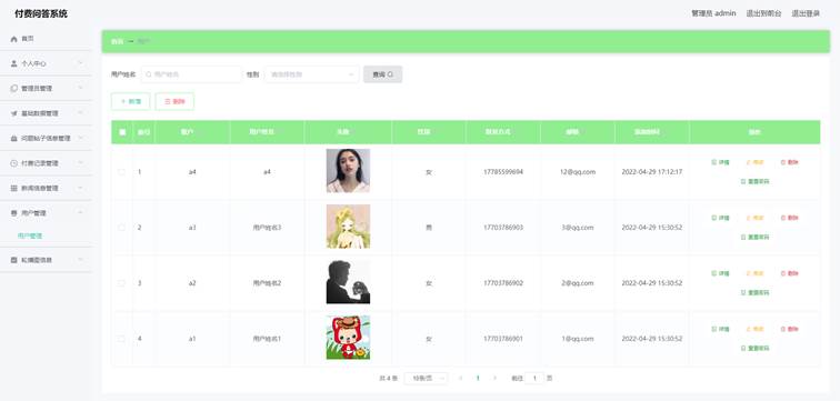 管理员进入如图5-4所示的用户管理界面之后,管理员点击信息显示栏中最右侧的详情,修改,删除,重置密码按钮可依次完成用户信息的详情查看,修改,删除,用户账号密码重置等操作,管理员查询用户需要在用户姓名的查询编辑框中登记用户姓名,然后查询用户,也能在性别旁边的查询编辑框中登记性别,然后查询用户。用户信息包括联系方式,头像,用户姓名等信息。