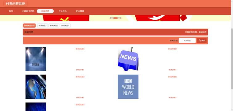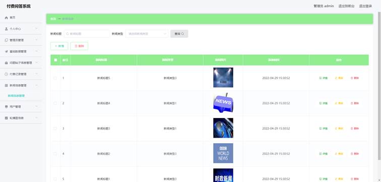 管理员进入如图5-3所示的新闻信息管理界面之后,管理员点击信息显示栏中最右侧的详情,修改,删除按钮可依次完成新闻信息的详情查看,修改,删除等操作。新闻信息包括新闻图片,新闻类型,新闻标题等信息。管理员查询新闻需要根据新闻类型来查询,也能在新闻标题的查询编辑框中登记新闻标题,然后查询新闻。
