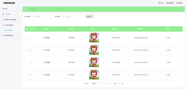 管理员进入如图5-2所示的付费记录管理界面之后,管理员点击信息显示栏中最右侧的详情,删除按钮可依次完成付费记录信息的详情查看,删除等操作,付费记录信息包括付费时间,帖子标题,用户姓名等信息。管理员查询付费记录可以根据用户姓名来查询,也能根据帖子标题来查询付费记录信息等。
