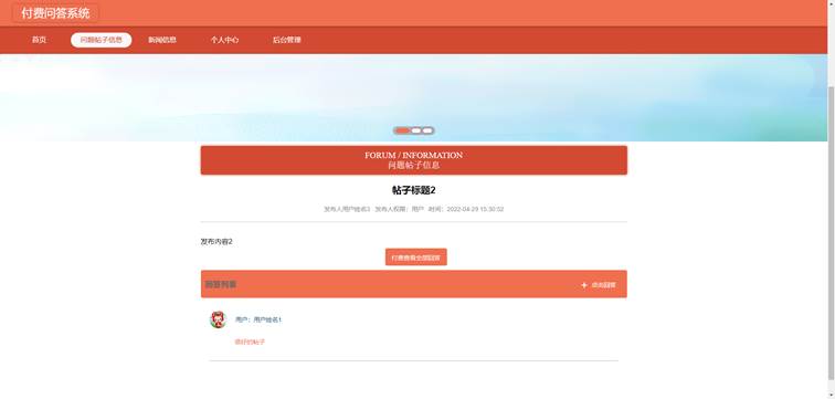 用户进入如图5-9所示的查看帖子界面之后,用户只能查看帖子的内容,还有自己回答的帖子信息,当用户想要查看其他用户发布的帖子回答信息的时候,就需要用户付费,才能够查看该帖子内容的所有回答信息。