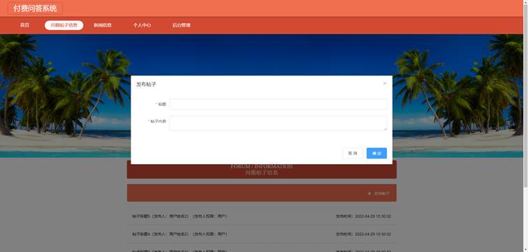 用户进入如图5-7所示的发布帖子界面之后,用户需要在标题旁边的文本输入框中登记帖子标题,在帖子内容旁边的文本框中输入帖子内容信息,最后点击确定按钮就可以把用户编辑的帖子进行发布。