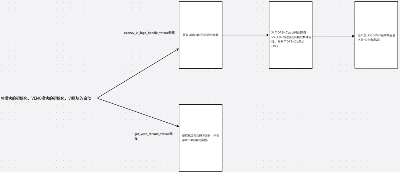 - opencv_vi_logo_handle_thread:负责从VI获取原始视频数据,通过OpenCV转换为Mat矩阵并进行logo叠加处理,最后将处理后数据发送至VENC编码器。
