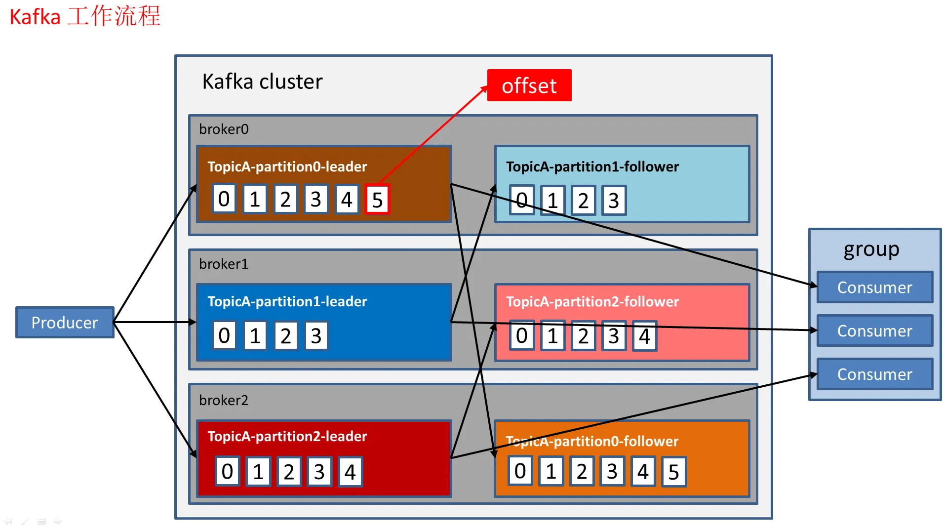 - 每个主题被划分为一个或多个分区。分区是消息存储和并行处理的基本单位。例如: $$ topic = { partition_0, partition_1, \dots, partition_{n-1} } $$