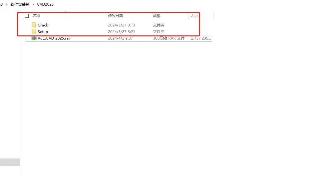 10.打开安装包解压后的【CAD2025】文件夹,双击打开【Crack】文件夹。