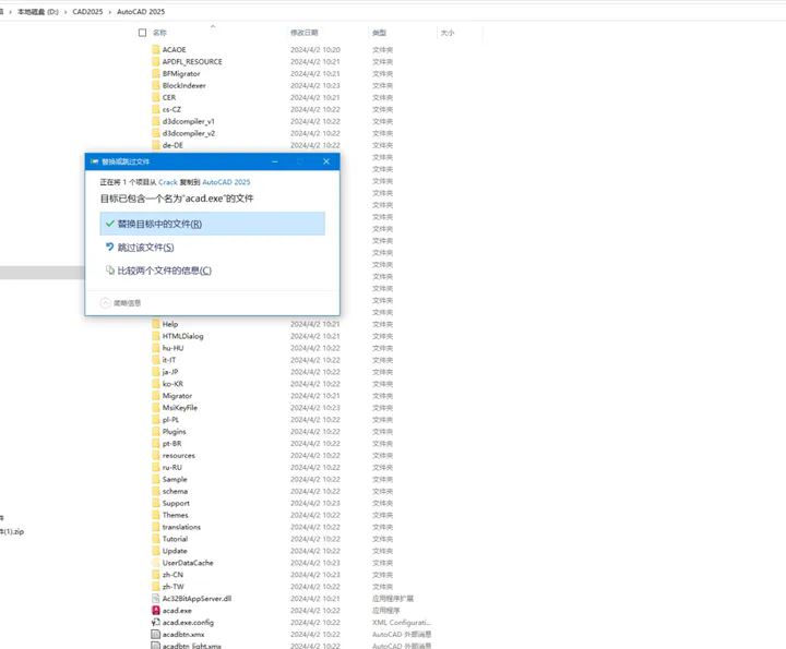 11.鼠标右击【acad】选择【复制,打开文件安装路径,在空白处,鼠标右击选择【粘贴】,点击【替换目标中的文件】。