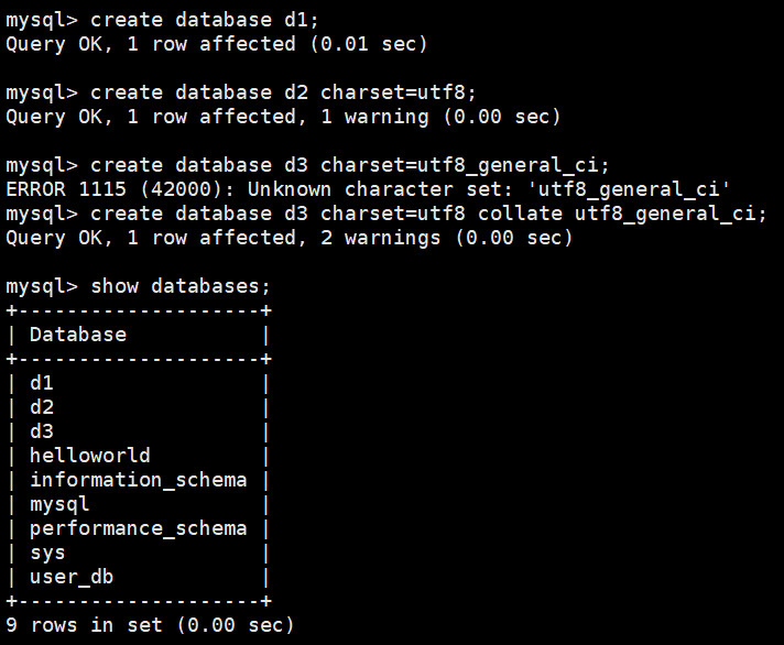 create database d3 charset=utf8 collate utf8_general_ci;//创建一个使用utf8字符集,并带校验规则的d3数据库