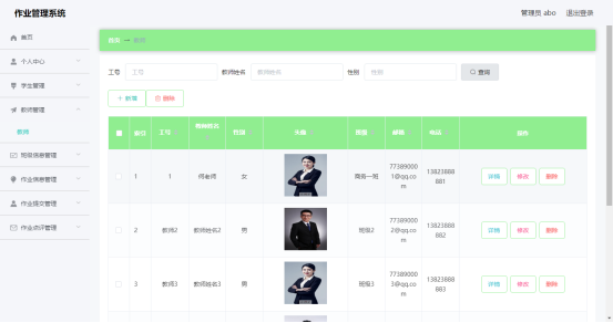 管理员可以对教师信息进行添加,删除,查询和修改操作。下图就是通讯录信息管理页面。