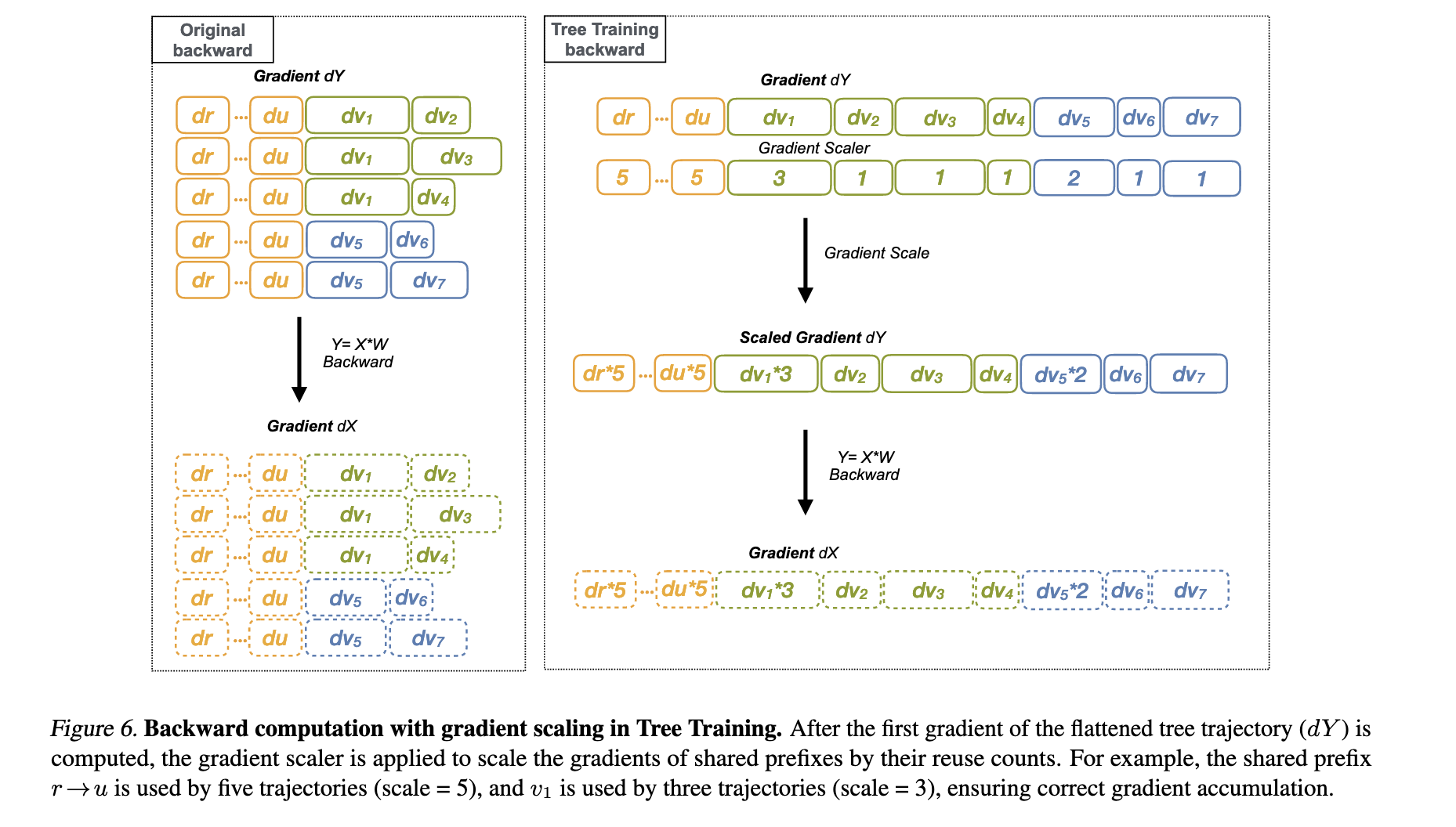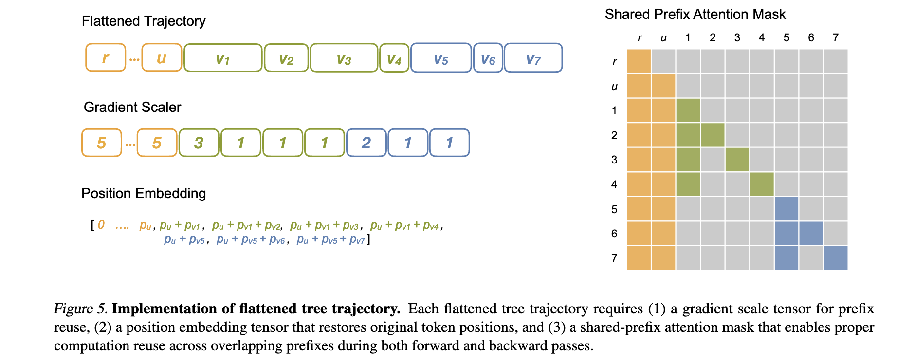 - 梯度累加:将来自不同分支的梯度正确累加到共享前缀的参数上