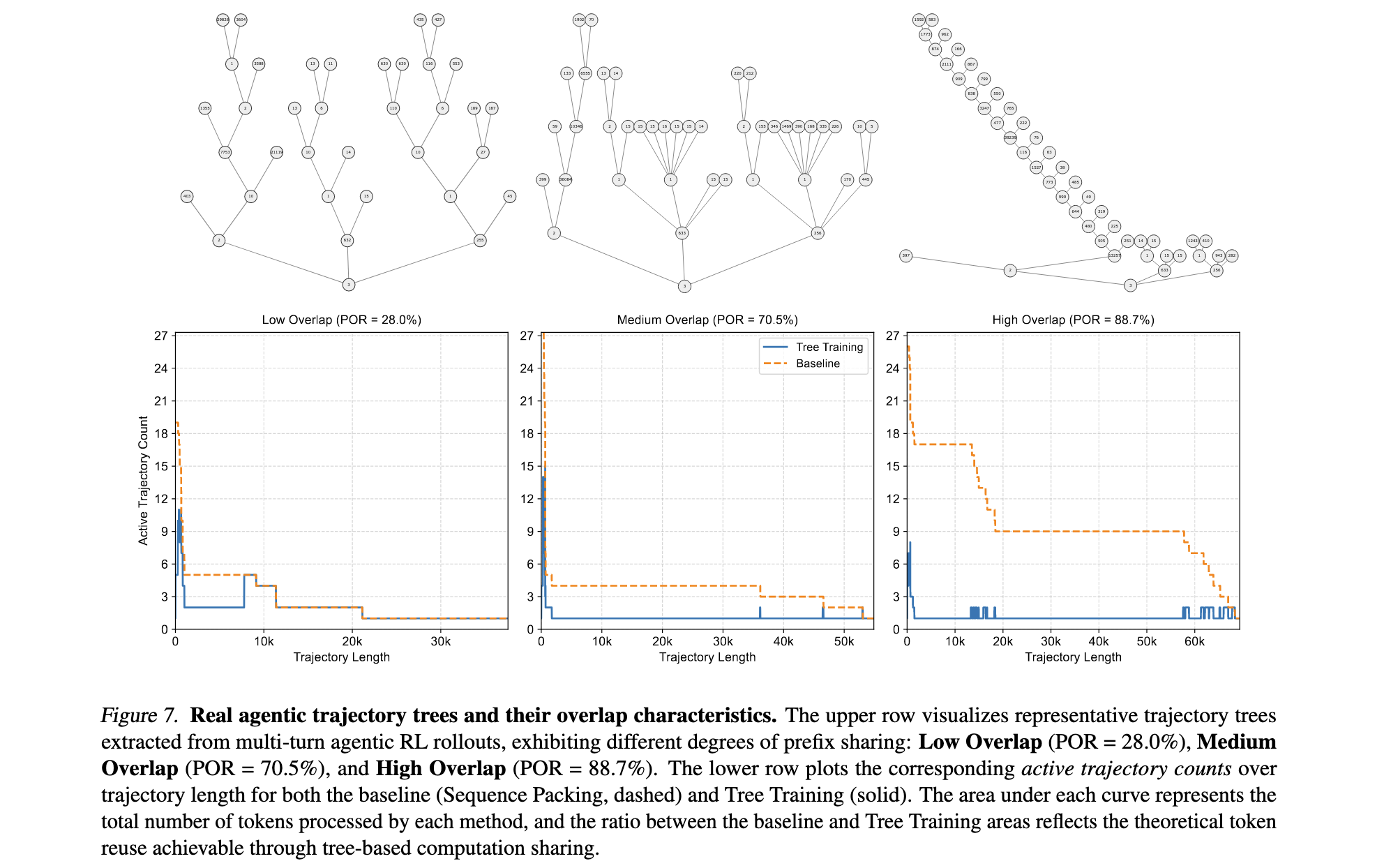 在智能体LLM场景中,单个rollout过程中的交互过程经常表现出分支行为。由于在特定决策点的内存检索和并发工具执行,一个任务的token轨迹演变为树状结构而非线性序列。然而,当前的训练管道将这种树状轨迹分解为独立的线性片段,将每个分支视为独立序列处理。这导致在前向和反向传播过程中,跨分支的共享前缀被重复计算,造成了严重的计算效率低下问题。