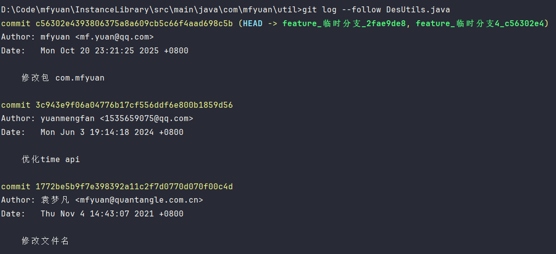 遇到一个奇怪的问题,我通过idea的git插件去查看文件的修改记录,可以看到完整的提交记录。但是通过 git log DesUtils.java 确只能看到一条。这就很奇怪了。我是一个比较纠结的人,所以得深究下。 🤣
