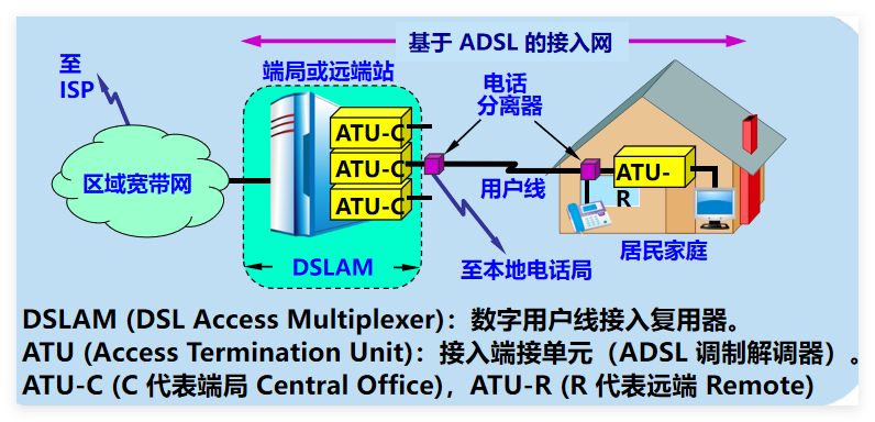 数字用户线接入复用器 DSLAM,用户线和用户家中的一些设施。