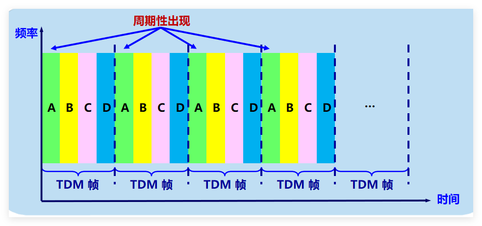 划分时间,所有用户在不同的时间占用同样的频带宽度。每一个时分复用的用户在每一个 TDM 帧中占用固定序号的时隙。