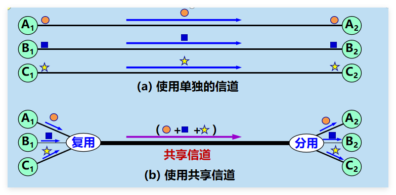 复用 (multiplexing) :允许用户使用一个共享信道进行通信。
