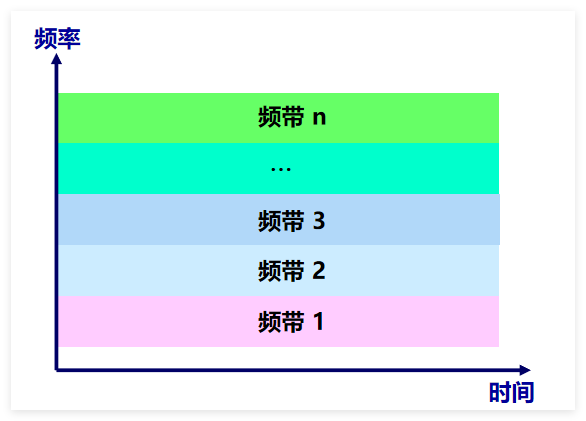 划分频带,所有用户在同样的时间占用不同的带宽(即频带)资源。用户分配到带宽后,在通信过程中会独占这个带宽。