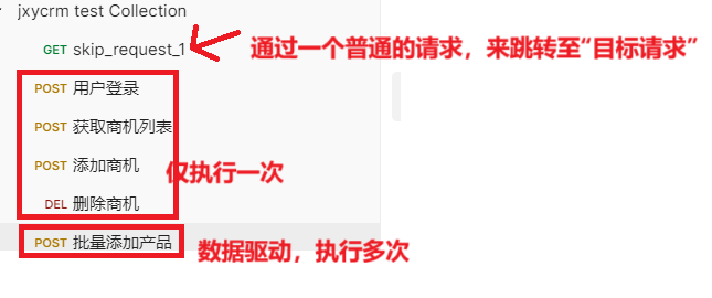 场景:测试请求集中,期望请求“用户登录、获取商机列表、添加商机、删除商机”仅执行一次,而请求“批量添加产品”采用“数据驱动”会执行多次。