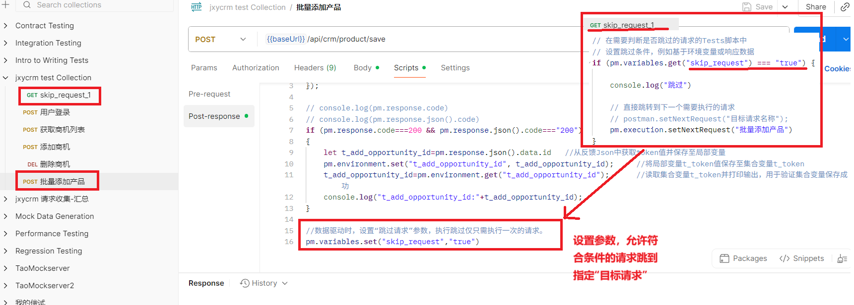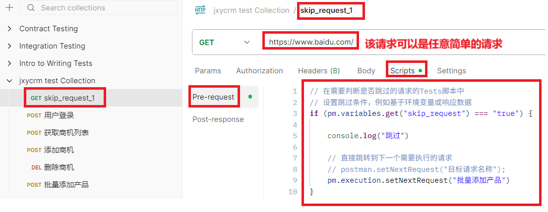 if (pm.environment.get("skip_request") === "true") {// 直接跳转到下一个需要执行的请求postman.setNextRequest("目标请求名称");