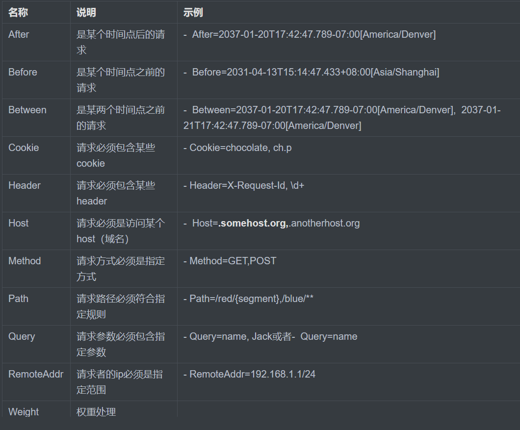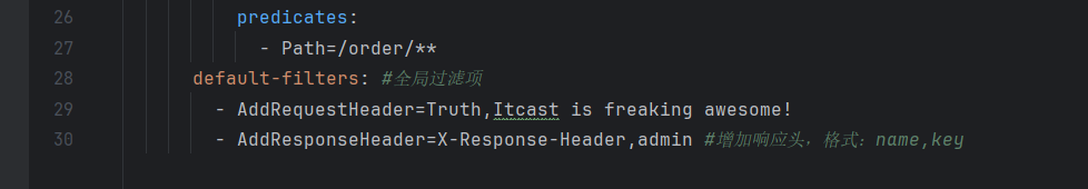 spring:application:name: gatewaycloud:nacos:server-addr: 120.27.236.84:8848,124.221.80.228:8848discovery:username: nacospassword: nacosnamespace: devgateway:routes:- id: user-service # 路由标示,必须唯一uri: lb://userservice # 路由的目标地址predicates: # 路由断言,判断请求是否符合规则- Path=/user/** # 路径断言,判断路径是否是以/user开头,如果是则符合- id: order-serviceuri: lb://orderservicepredicates:- Path=/order/**