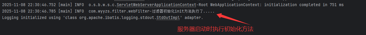 public class webFilter implements Filter {/** 初始化方法,web服务器启动时执行,只执行一次* 一般做一些资源/环境的准备工作* 需要时实现 不需要时可不实现 接口中已经默认实现* */@Overridepublic void init(FilterConfig filterConfig) throws ServletException {log.info("过滤器初始化init方法执行了.....");}/** 拦截到请求之后执行 会执行多次* */@Overridepublic void doFilter(ServletRequest servletRequest, ServletResponse servletResponse, FilterChain filterChain) throws IOException, ServletException {log.info("拦截到了请求");// 放行操作 不写服务器则不会返回结果filterChain.doFilter(servletRequest, servletResponse);log.info("放行后逻辑执行");}/** 销毁方法,web服务器关闭的时候执行,只执行一次* 一般做一些资源释放/环境清理工作* 需要时实现 不需要时可不实现 接口中已经默认实现* */@Overridepublic void destroy() {log.info("过滤器销毁方法destroy执行了.....");}