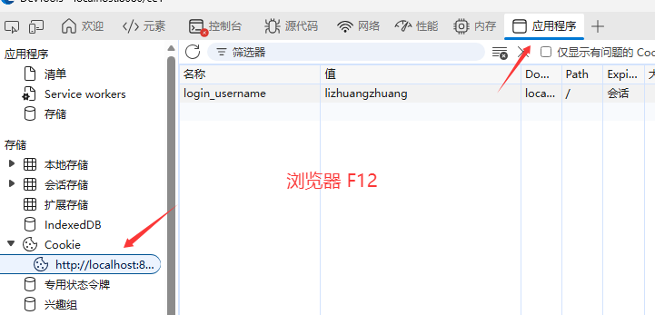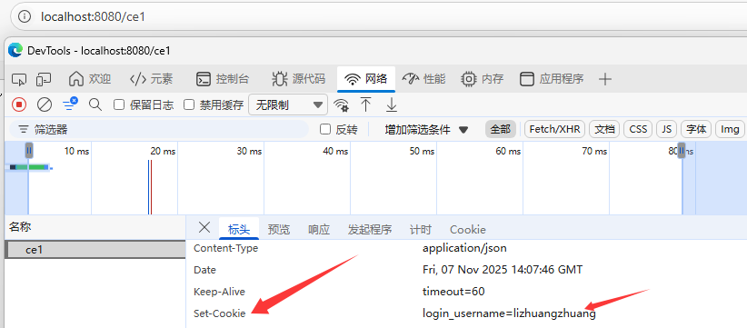//设置Cookie@GetMapping("/ce1")public Result cookie1(HttpServletResponse response){//设置Cookie/响应Cookieresponse.addCookie(new Cookie("login_username","lizhuangzhuang"));return Result.success();}//获取Cookie@GetMapping("/ce2")public Result cookie2(HttpServletRequest request){Cookie[] cookies = request.getCookies();for (Cookie cookie : cookies) {if(cookie.getName().equals("login_username")){//输出name为login_username的cookieSystem.out.println("login_username: "+cookie.getValue());}}return Result.success();}
