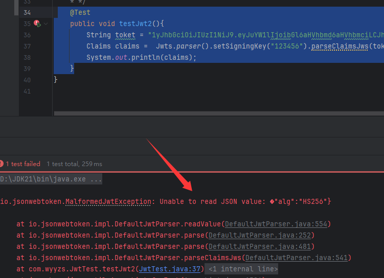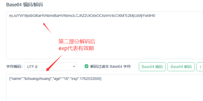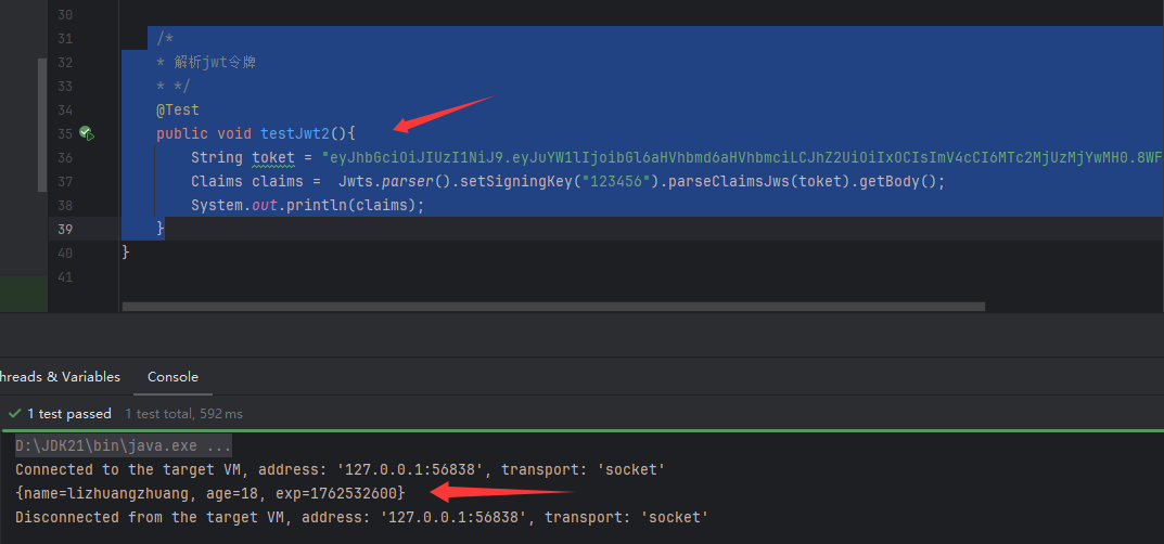 /** 解析jwt令牌* */@Testpublic void testJwt2(){String toket = "eyJhbGciOiJIUzI1NiJ9.eyJuYW1lIjoibGl6aHVhbmd6aHVhbmciLCJhZ2UiOiIxOCIsImV4cCI6MTc2MjUzMjYwMH0.8WF4okYi-k94WttbNAxRl90HsO9TsaW4YeTzQ2SIYMI";Claims claims = Jwts.parser().setSigningKey("123456").parseClaimsJws(toket).getBody();System.out.println(claims);}