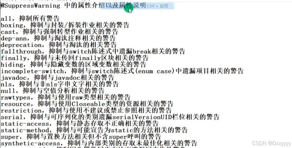 1、当我们不希望看到这些警告的时候,可以使用SuppressWarnings注解来抑制警告信息