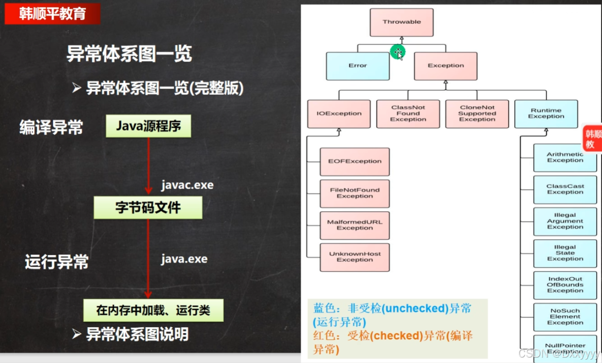 2.运行时异常,编译器检查不出来。一般是指编程时的逻辑错误,是程序员应该避免其出现的异常。java.lang.RuntimeException类及它的子类都是运行时异常