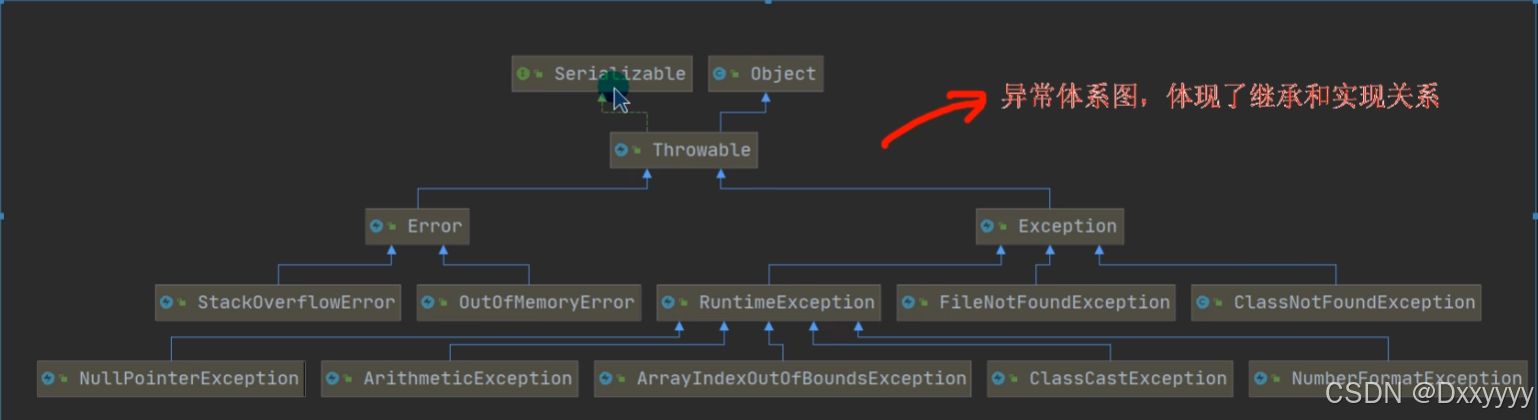2)Exception:其它因编程错误或偶然的外在因素导致的一般性问题,可以使用针对性的代码进行处理。例如空指针访问,试图读取不存在的文件,网络连接中断等等,Exception分为两大类:运行时异常[ ]和编译时异常[ ]。