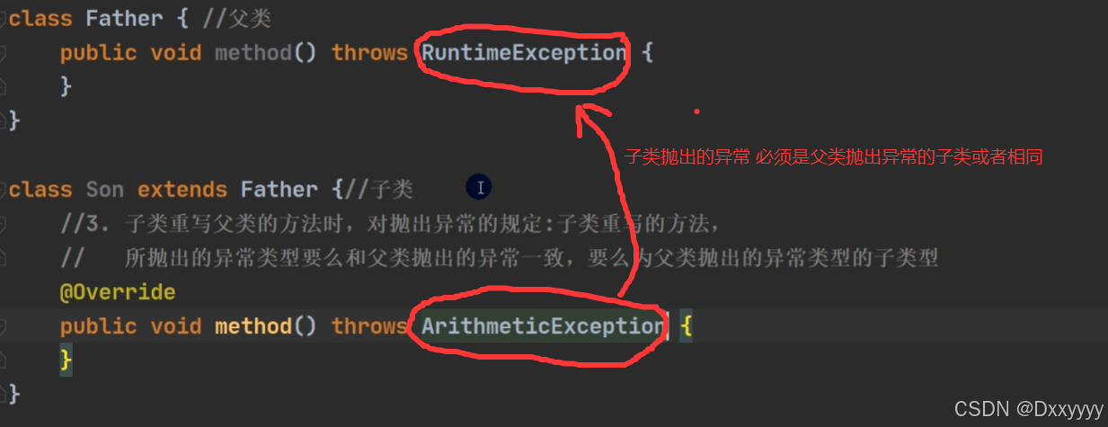 3)子类重写父类的方法时,对抛出异常的规定:子类重写的方法,所抛出的异常类型要么和父类抛出的异常一致,要么为父类抛出的异常的类型的子类型[举例]