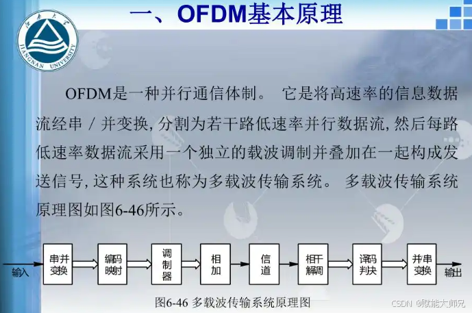 OFDM属于多载波调制(Multi-Carrier Modulation, MCM)的一种,它将整个信道带宽划分成多个正交的子信道,每个子信道传输一个低速子数据流。