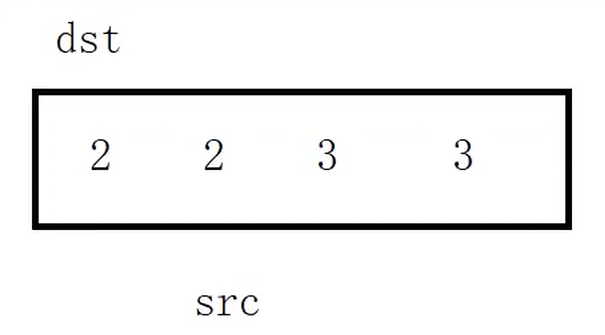 思路二:双指针法。创建两个变量dst和src,分别指向数组起始和下一个位置,①如果src的值和dst的值相等,src++;②如果src的值和dst的值不相等,dst++,然后把src的值赋值给dst,src++。