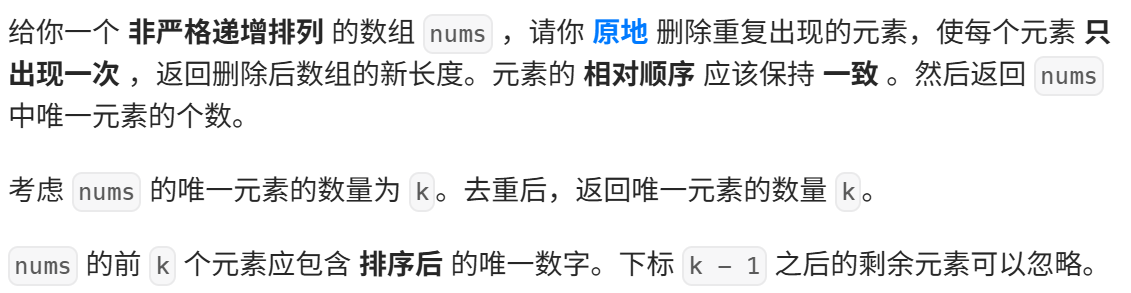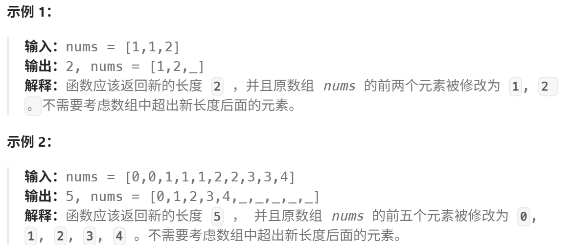 int removeDuplicates(int* nums, int numsSize) {//定义两个变量int dst=0;int src=dst+1;while(src!=numsSize){if(nums[src]!=nums[dst]){dst++;if(src!=dst){nums[dst]=nums[src];}}src++;}return dst+1;