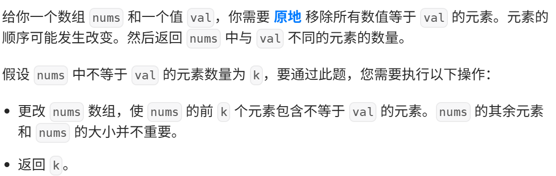 思路一:申请一个新数组,使新数组空间大小与原数组大小相等,遍历原数组,将值不为val的数放入新数组中,再将新数组中的数导入到原数组中。时间复杂度为O(N),空间复杂度也为O(N)。