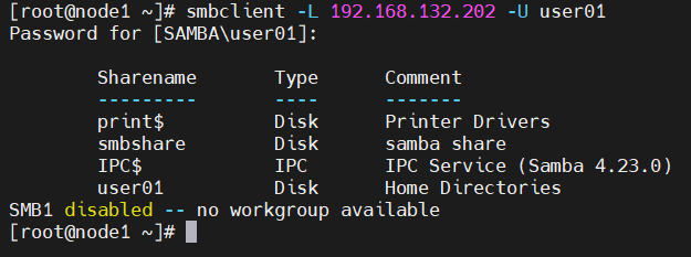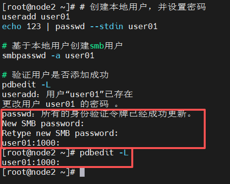 # 创建本地用户,并设置密码 useradd user01 echo 123 | passwd --stdin user01# 基于本地用户创建smb用户 smbpasswd -a user01# 验证用户是否添加成功 pdbedit -L