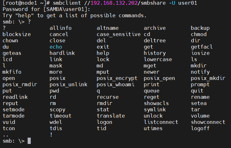 smbclient //192.168.132.202/smbshare -U user01# 进入共享目录, 输入 ? 可以查看支持的命令