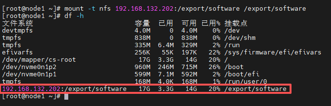 # node1执行: 创建挂载目录 mkdir -p /export/software # (一定是一个空目录, 以免挂载后,将不显示原有磁盘的内容)# 执行挂载操作: mount -t nfs 192.168.132.202:/export/software /export/software# 执行后,可以通过df -h 的方式查看是否挂载成功