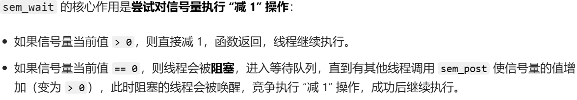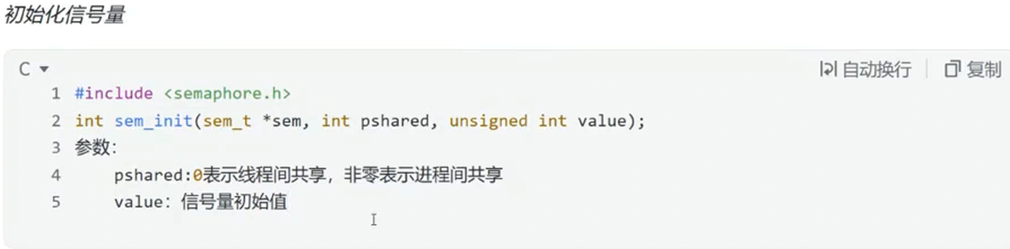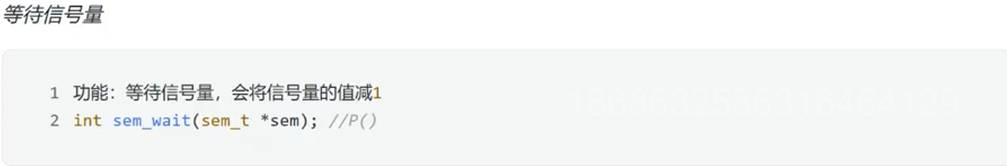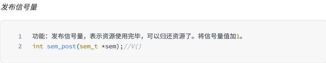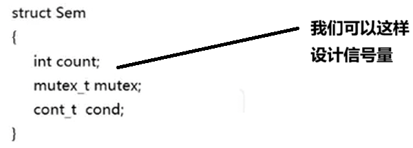 {int defalutsemval = 1;class Sem{public:Sem(int value = defalutsemval) : _init_value(value){int n = ::sem_init(&_sem, 0, _init_value);(void)n;}void P(){int n = ::sem_wait(&_sem);//就是--(void)n;}void V(){int n = ::sem_post(&_sem);//就是++(void)n;}~Sem(){int n = ::sem_destroy(&_sem);(void)n;}private:sem_t _sem;int _init_value;};