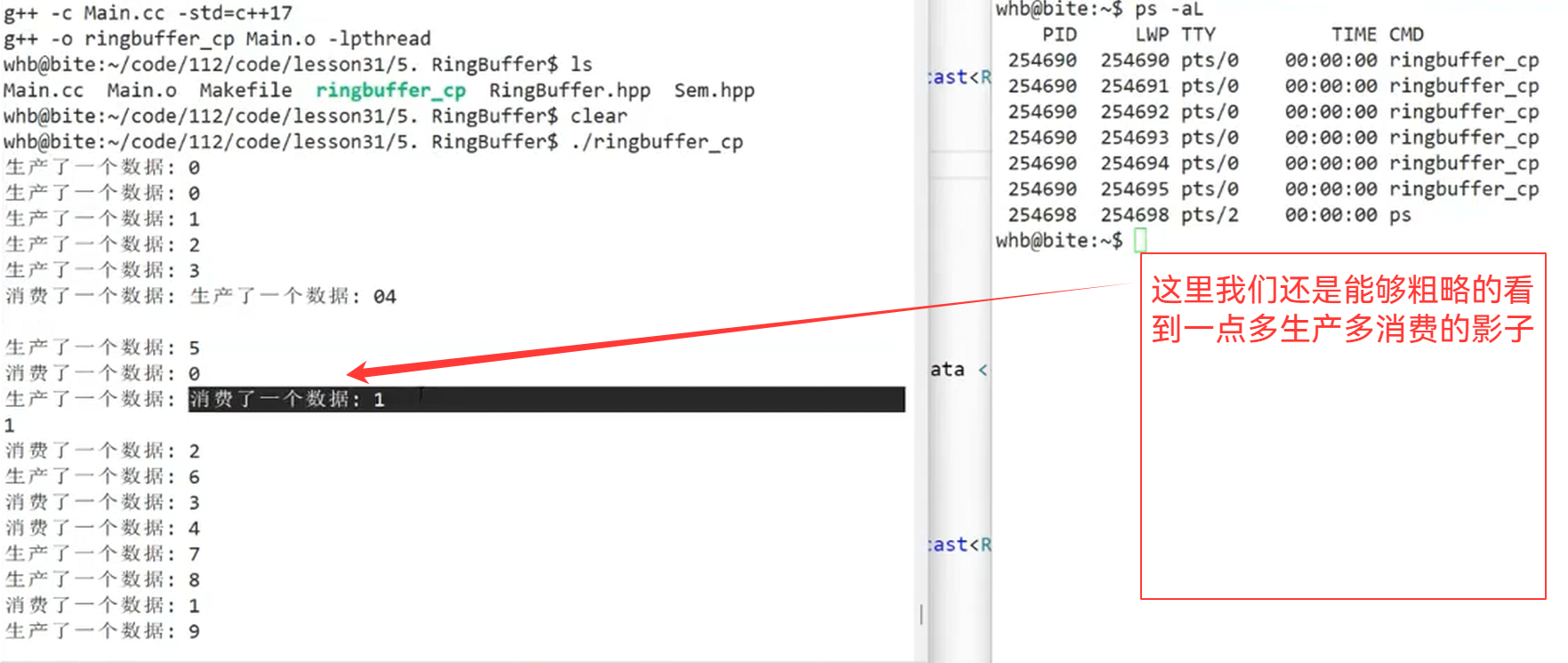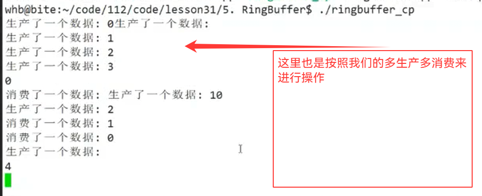 {RingBUffer<int>* ring_buffer = new RingBUffer<int>();//共享资源 -> 临界资源//单生产,单消费pthread_t c1,p1;pthread_create(&c1,nullptr,Consumer,ring_buffer);pthread_create(&p1,nullptr,Productor,ring_buffer);pthread_join(c1,nullptr);pthread_join(p1,nullptr);delete ring_buffer;return 0;