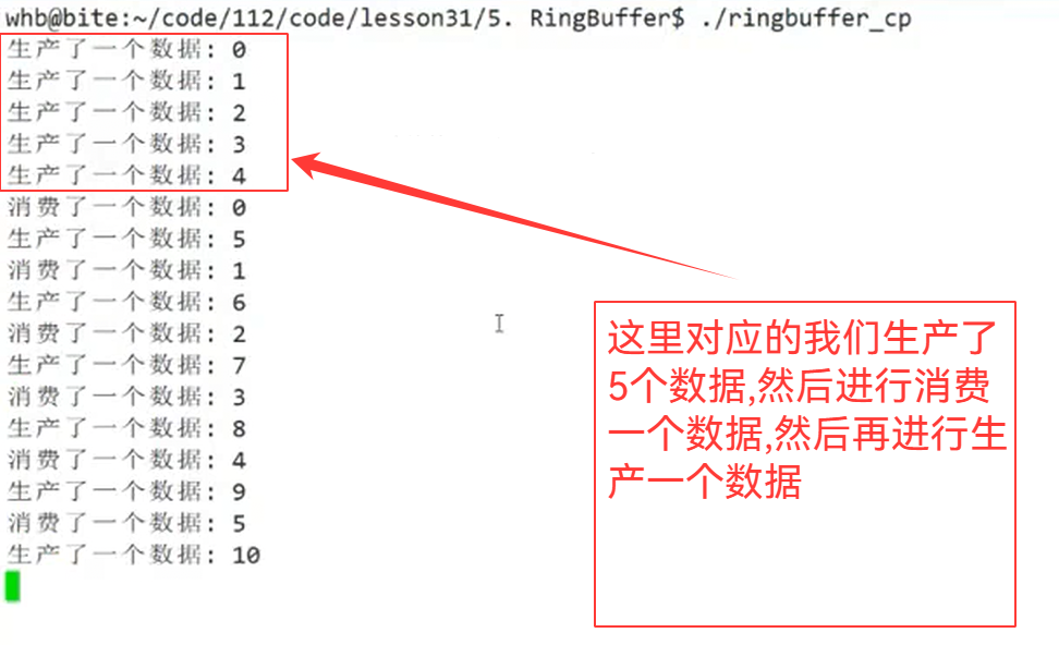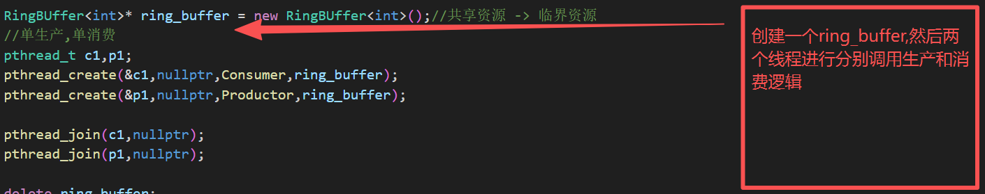 {RingBuffer<int>* ring_buffer = new RingBuffer<int>(5);//共享资源 -> 临界资源//单生产,单消费pthread_t c1,p1;pthread_create(&c1,nullptr,Consumer,ring_buffer);pthread_create(&p1,nullptr,Productor,ring_buffer);pthread_join(c1,nullptr);pthread_join(p1,nullptr);delete ring_buffer;return 0;