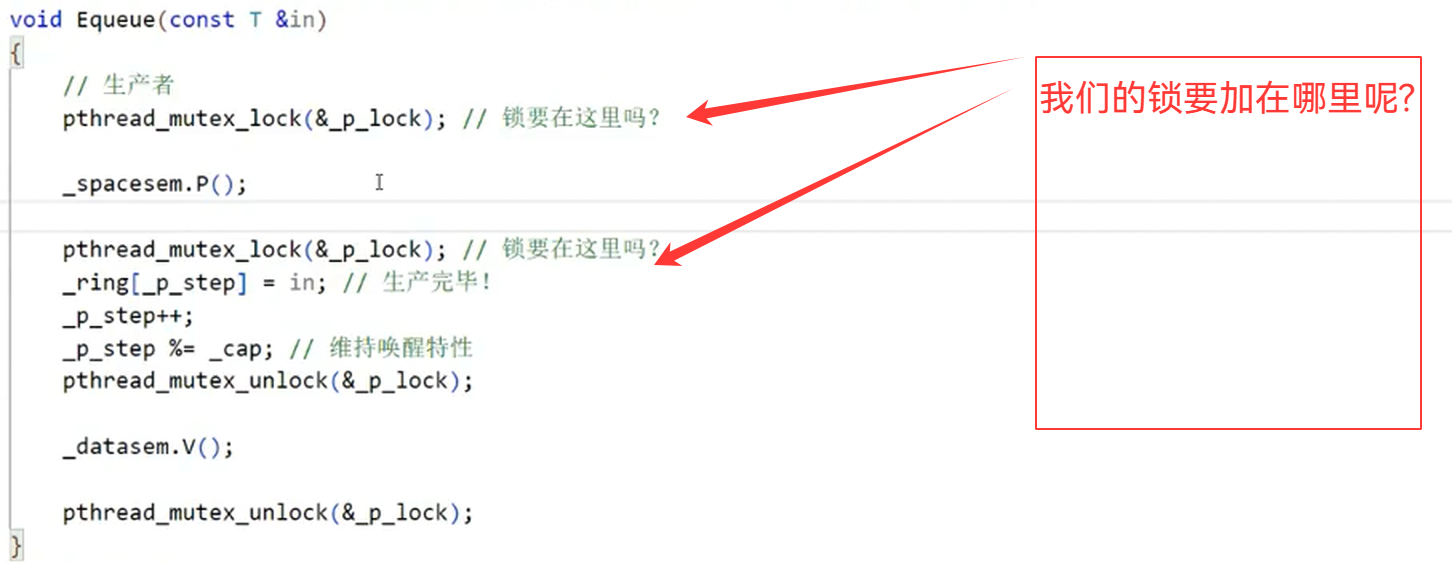 void Equeue(const T& in){//生产者_spacesem.P();_ring[_p_step] = in;_P_step++;_p_step %= _cap;_datasem.V();}