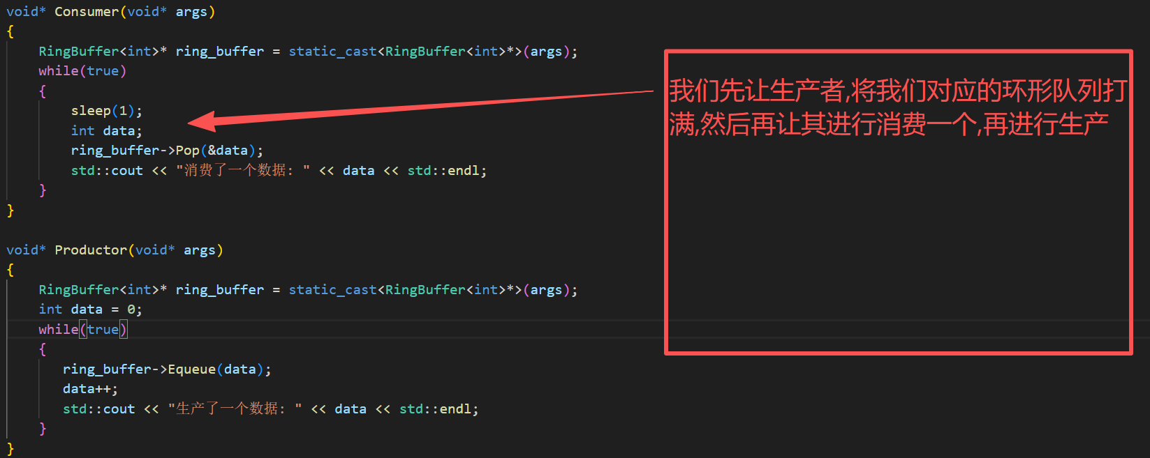 {RingBUffer<int>* ring_buffer = static_cast<RingBUffer<int>*>(args);while(true){int data;ring_buffer->Pop(&data);}