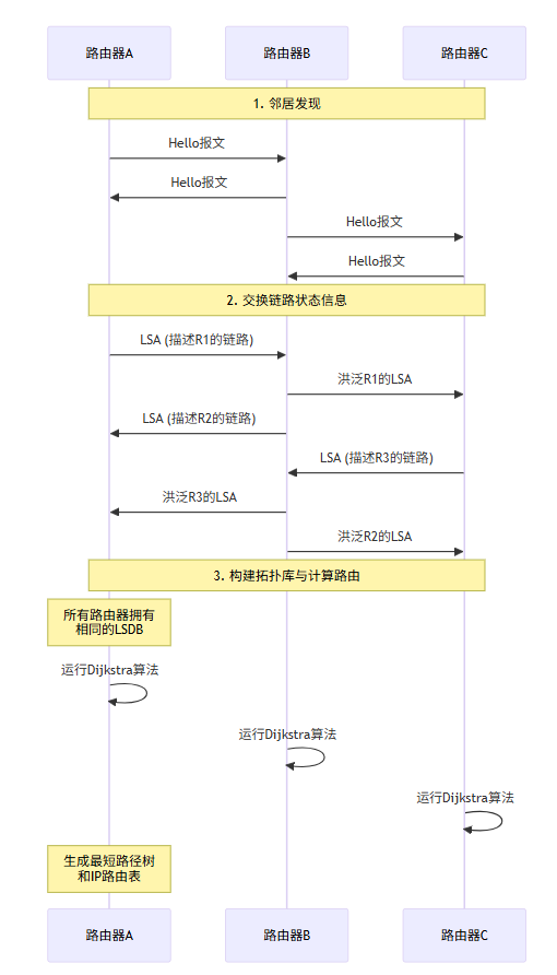 下图直观地展示了OSPF从邻居发现到生成路由表的完整工作流程:
