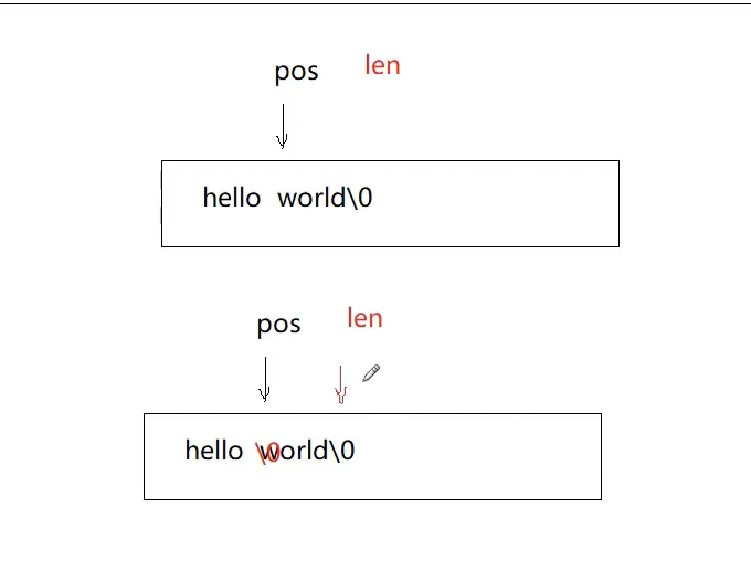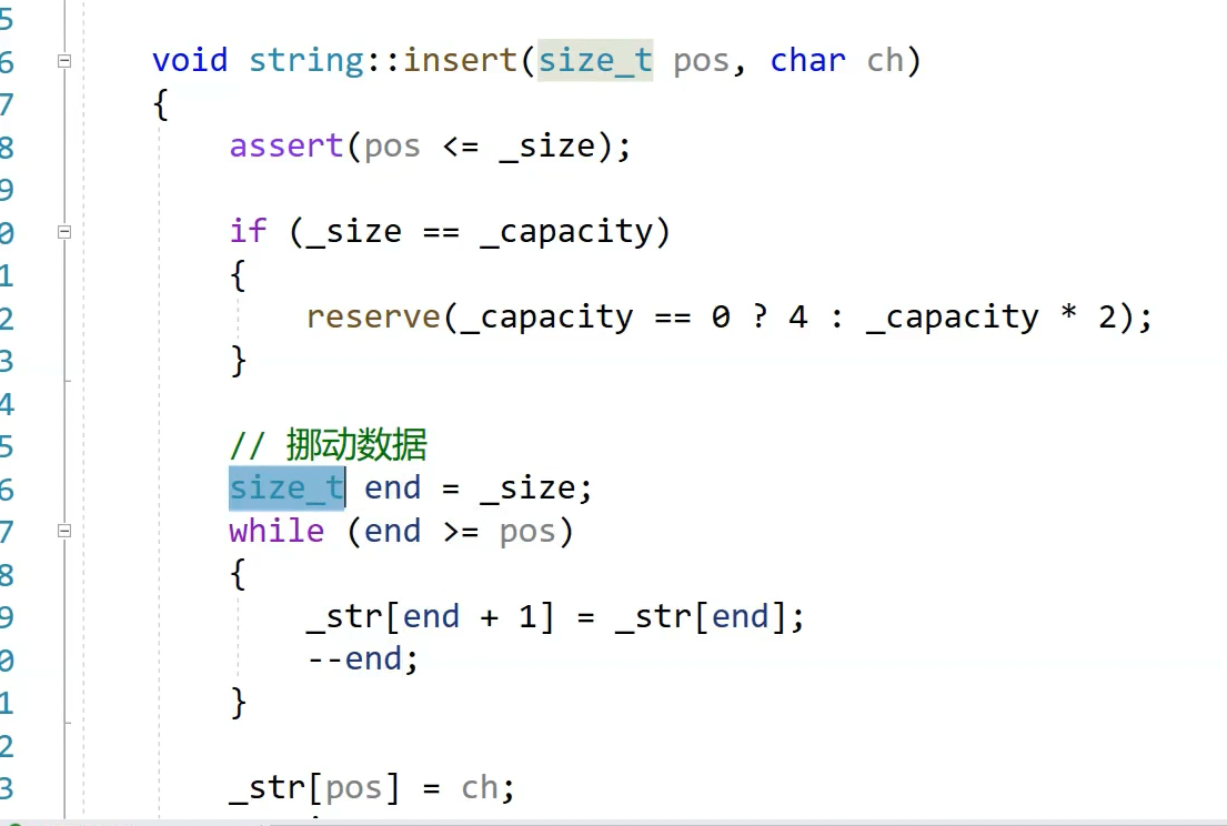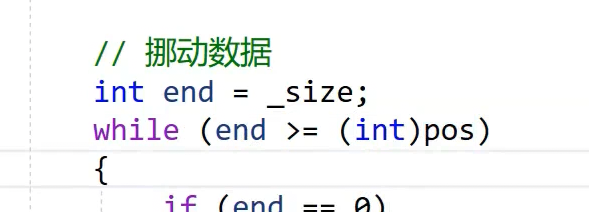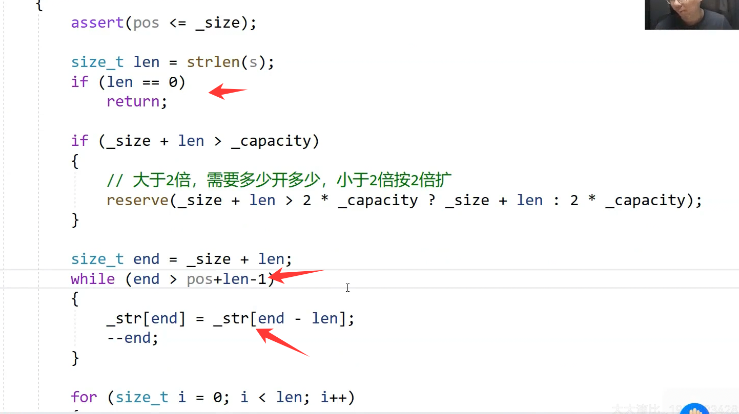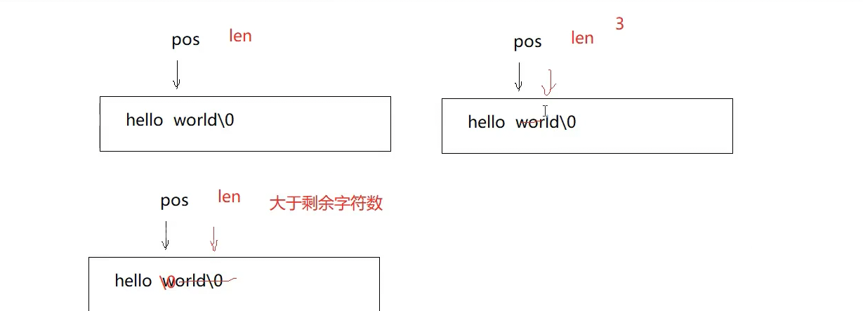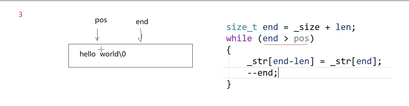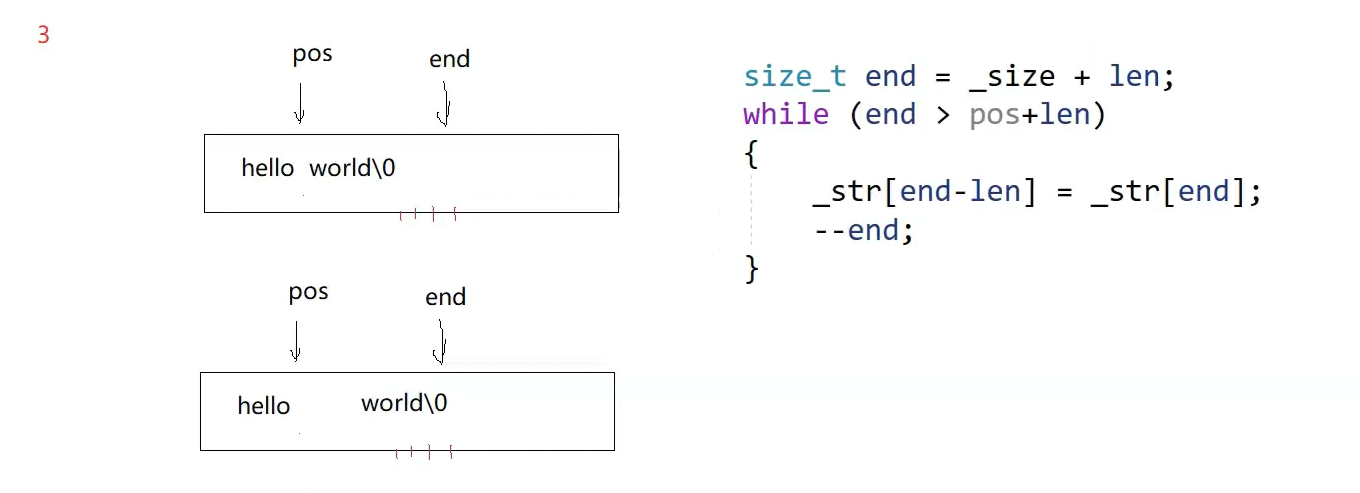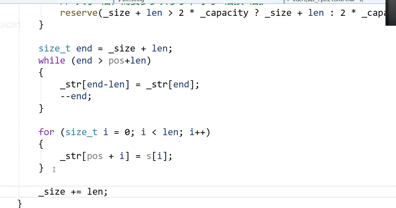 void string::erase(size_t pos, size_t len){assert(pos < _size);if (len >= _size - pos){_str[pos] = '\0';_size = pos;}else{for (size_t i = pos + len; i <= _size; i++){_str[i - len] = _str[i];}_size -= len;}}尽可能保持画图,才能不出错