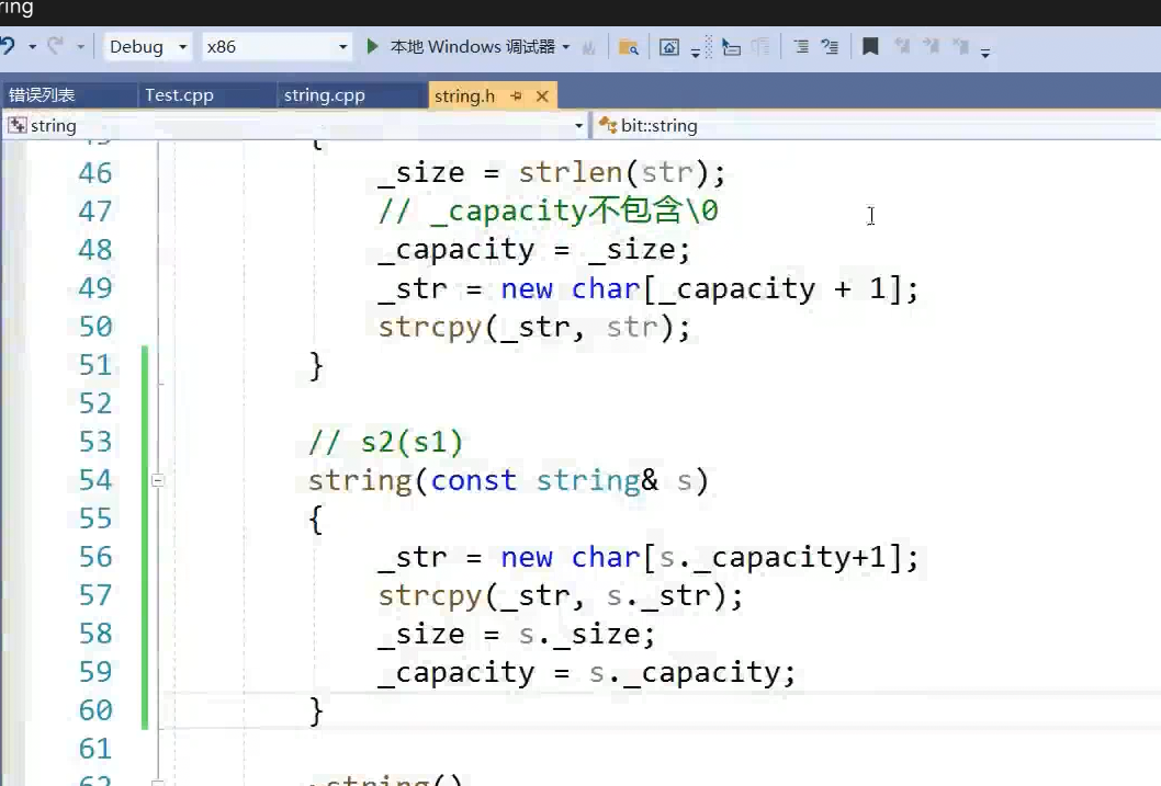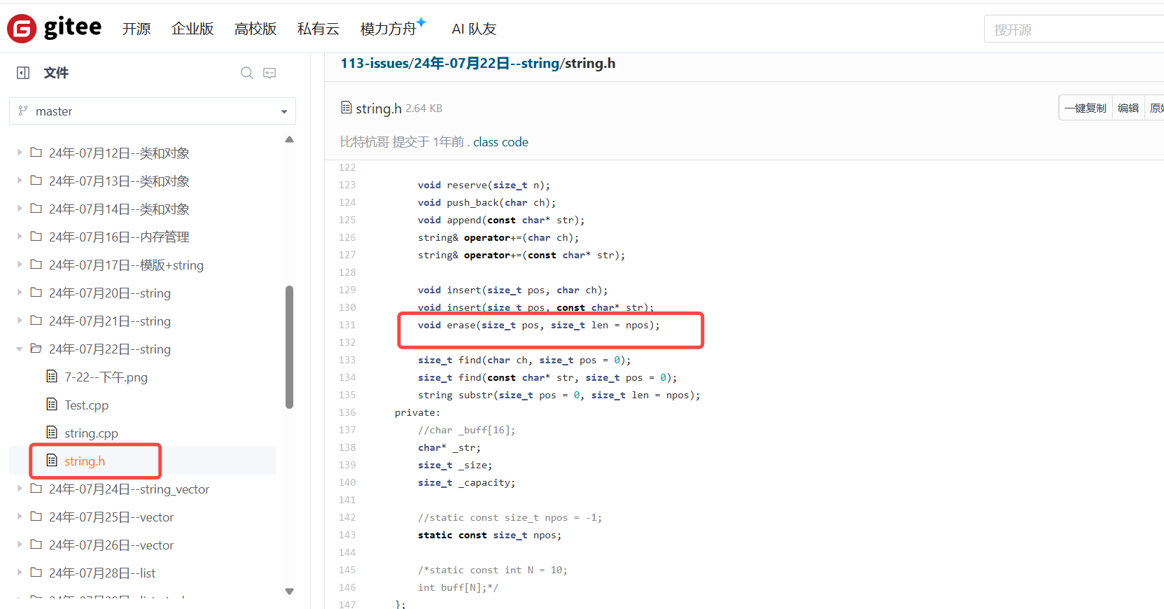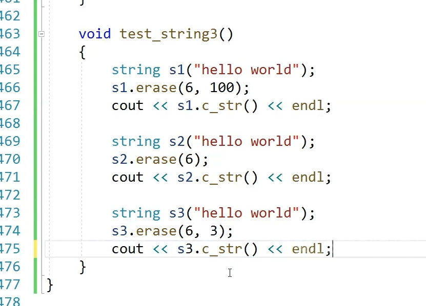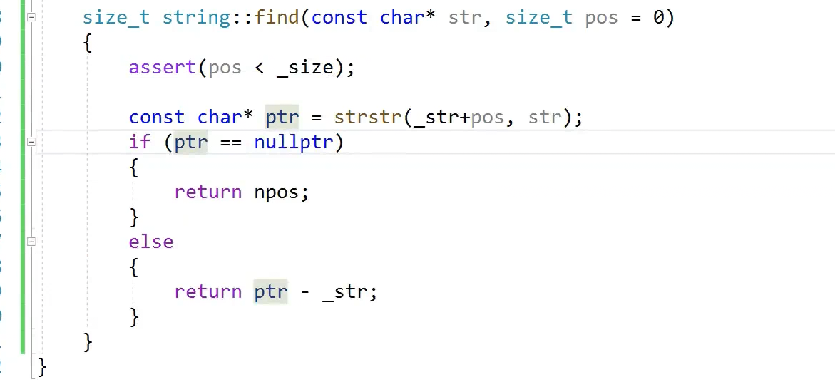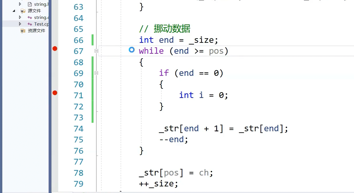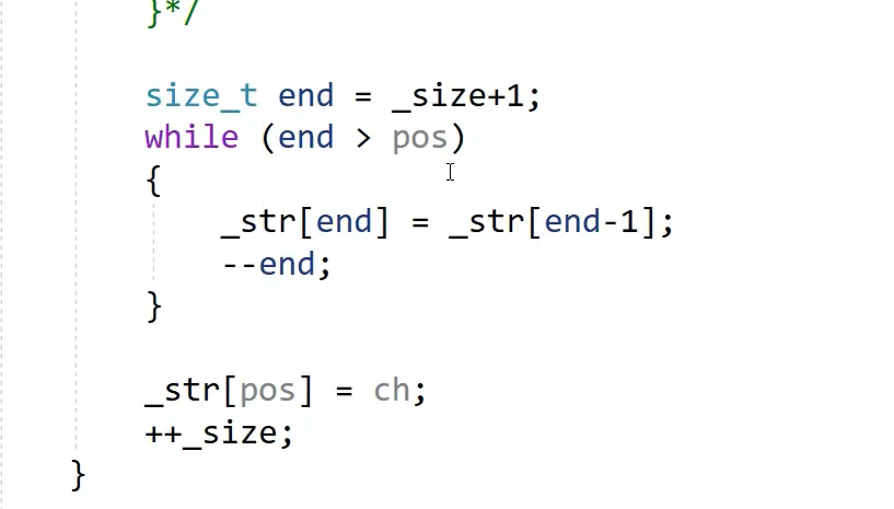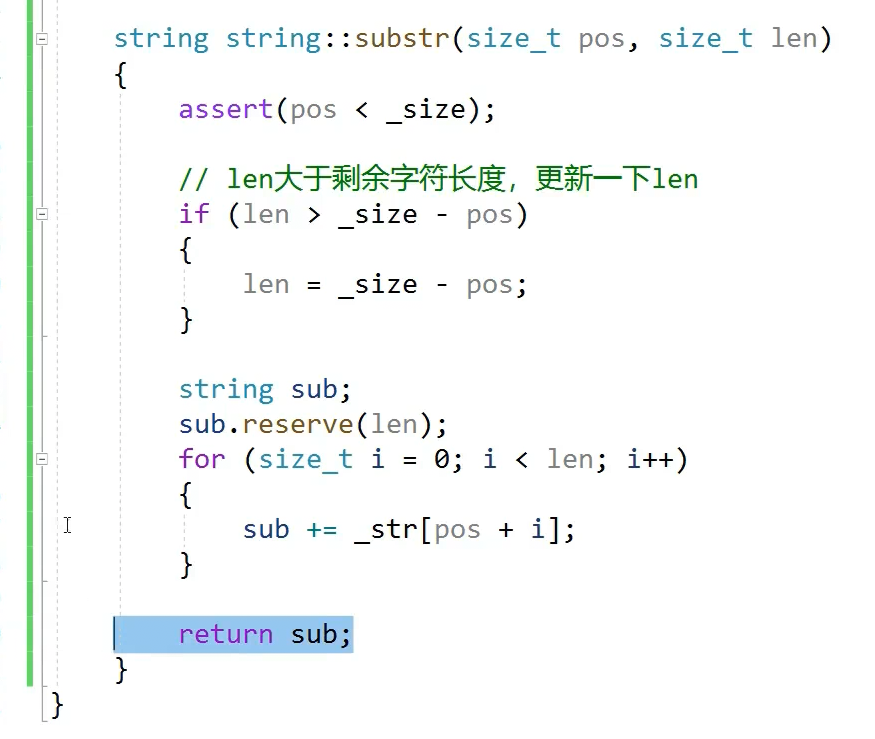 void string::erase(size_t pos, size_t len){assert(pos < _size);if (len >= _size - pos){_str[pos] = '\0';_size = pos;}else{for (size_t i = pos + len; i <= _size; i++){_str[i - len] = _str[i];}_size -= len;}}尽可能保持画图,才能不出错
