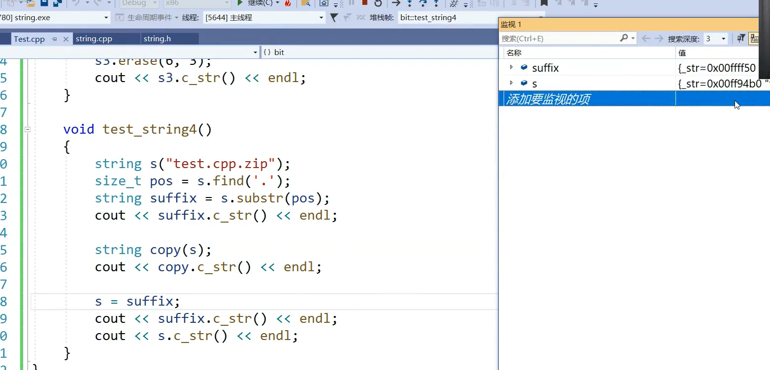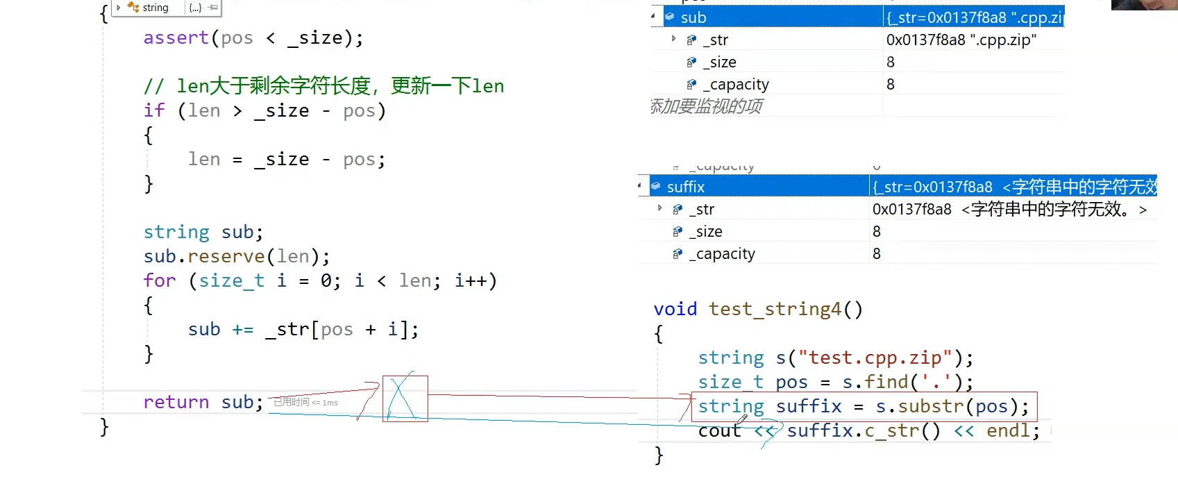 sub拷贝构造临时对象,再拷贝构造,编译器优化了中间的,没有写拷贝构造,这里默认是浅拷贝,出了作用于sub销毁了,suffix是野指针了,这应该用深拷贝,release为啥没问题,和三唯一,把临时对象 优化掉了,把sub也给优化掉了。直接让suffix充当sub了,没有触发这个bug,