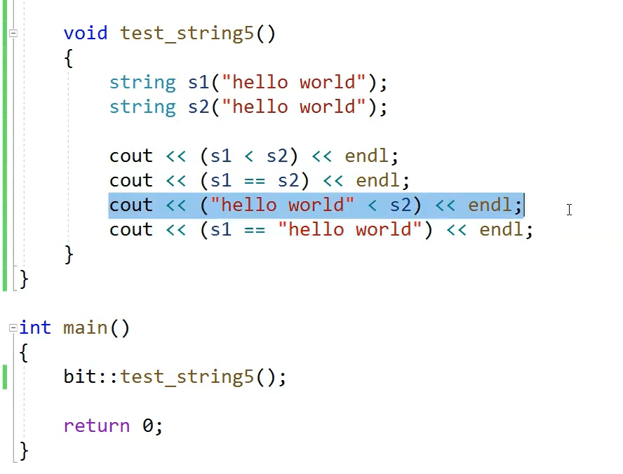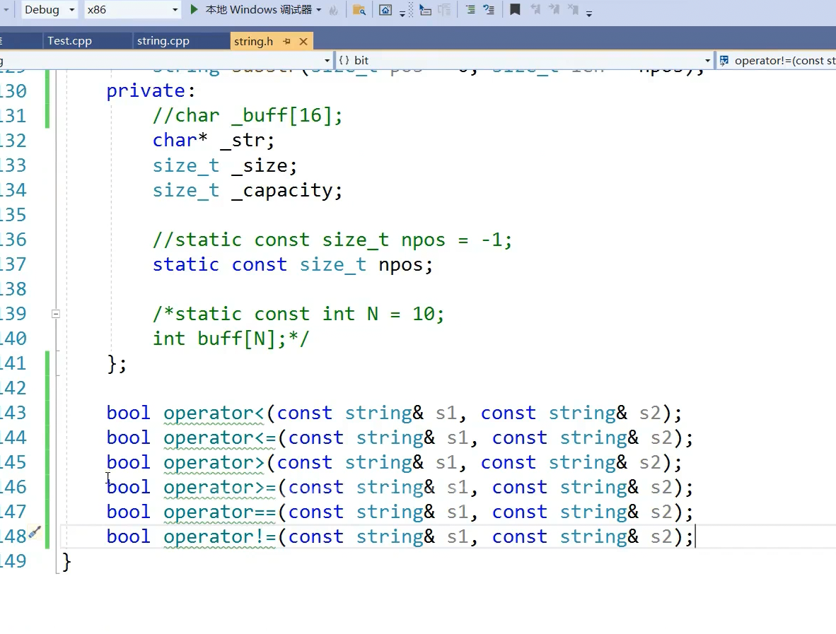 bool operator<(const string& s1, const string& s2){return strcmp(s1.c_str(), s2.c_str()) < 0;}bool operator<=(const string& s1, const string& s2){return s1 < s2 || s1 == s2;}bool operator>(const string& s1, const string& s2){return !(s1 <= s2);}bool operator>=(const string& s1, const string& s2){return !(s1 < s2);}bool operator==(const string& s1, const string& s2){return strcmp(s1.c_str(), s2.c_str()) == 0;}bool operator!=(const string& s1, const string& s2){return !(s1 == s2);}库里面三个版本,string和string,string和字符串。字符串和字符串而我们只写了一个版本