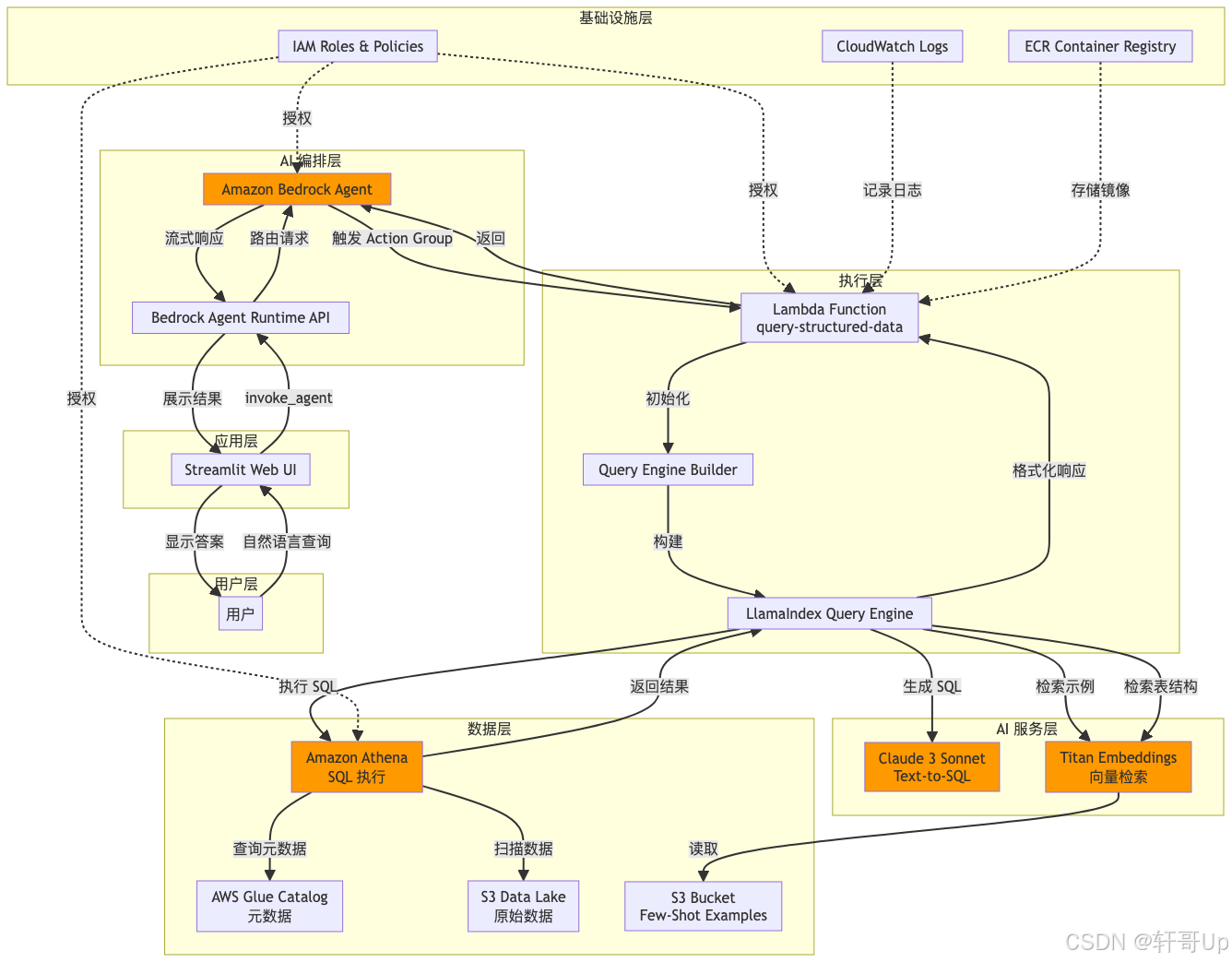 本文深度剖析基于 Amazon Bedrock Agent 的智能数据库查询系统,该系统通过 LLM 驱动的 Text-to-SQL 技术实现自然语言到结构化数据的查询转换。系统采用 Lambda 函数作为 Action Group、LlamaIndex 作为查询引擎、Athena 作为数据源,结合 Few-Shot Learning 和向量检索技术,构建了一个高效的 AI 驱动数据分析平台。本文将从架构设计、核心实现到部署实践进行全面解读。