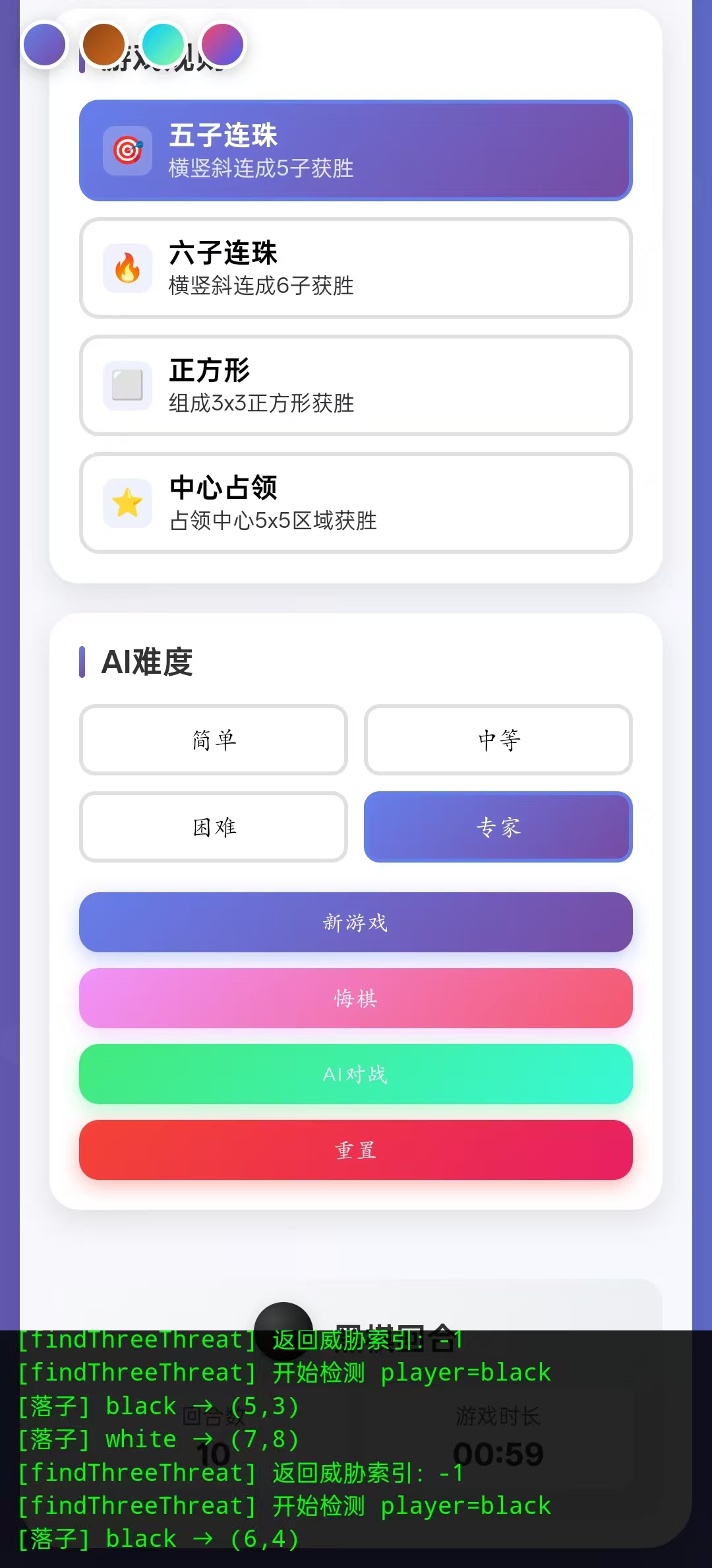 log(`[checkThreeInDirection] (${row},${col}) dir(${dx},${dy}) → ${res ? '✅活三' : '❌不是活三'}`);