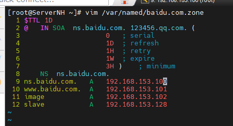 #编辑正向解析区域数据文件baidu.com.zone,添加从服务器解析