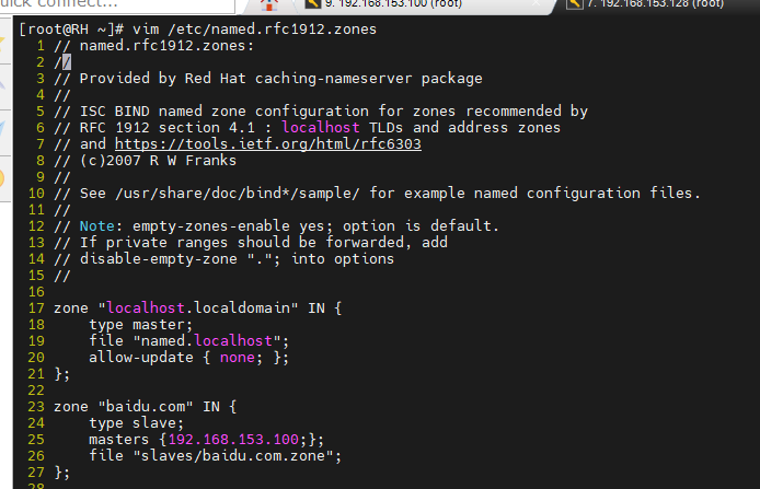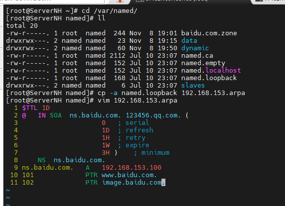 #进入/var/named目录下,完全权限复制反向解析文件魔板named.loopback,然后编辑反向解析文件192.168.153.arpa(文件里的@表示的还是baidu.com.)